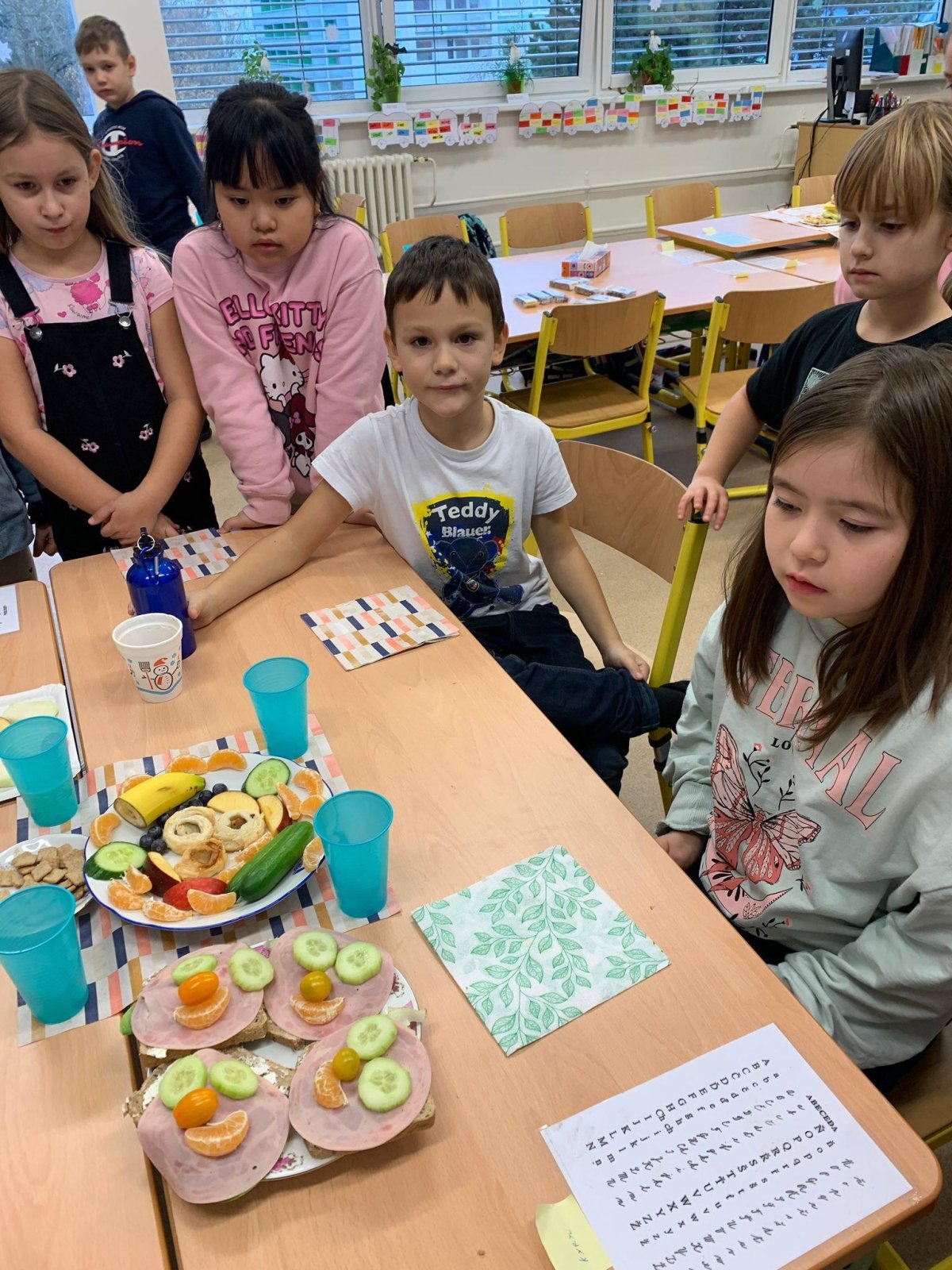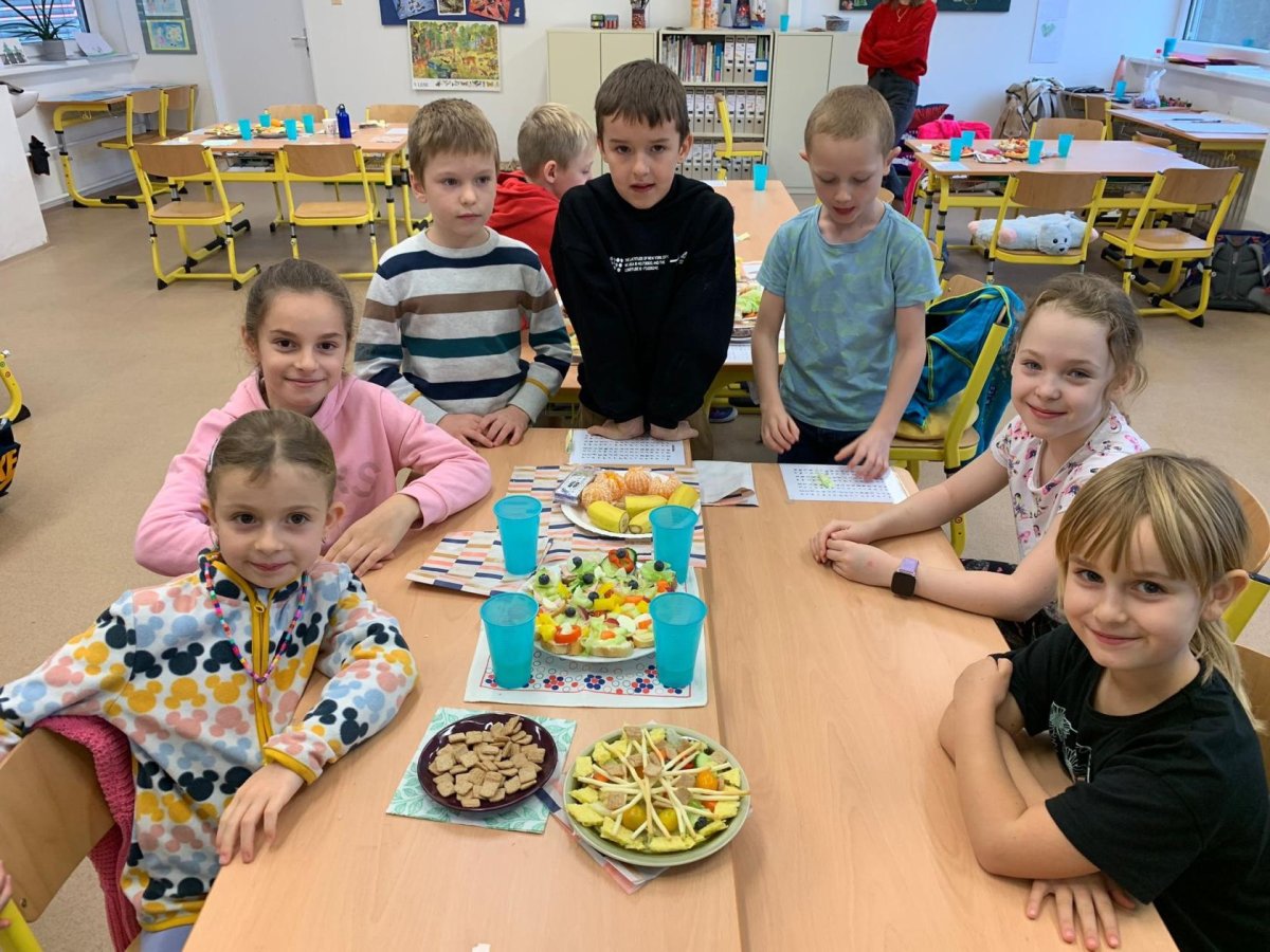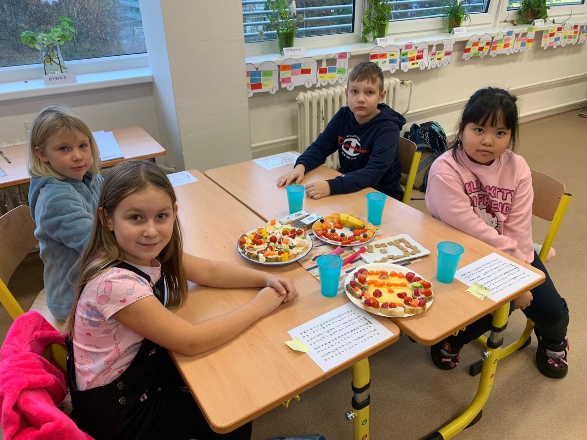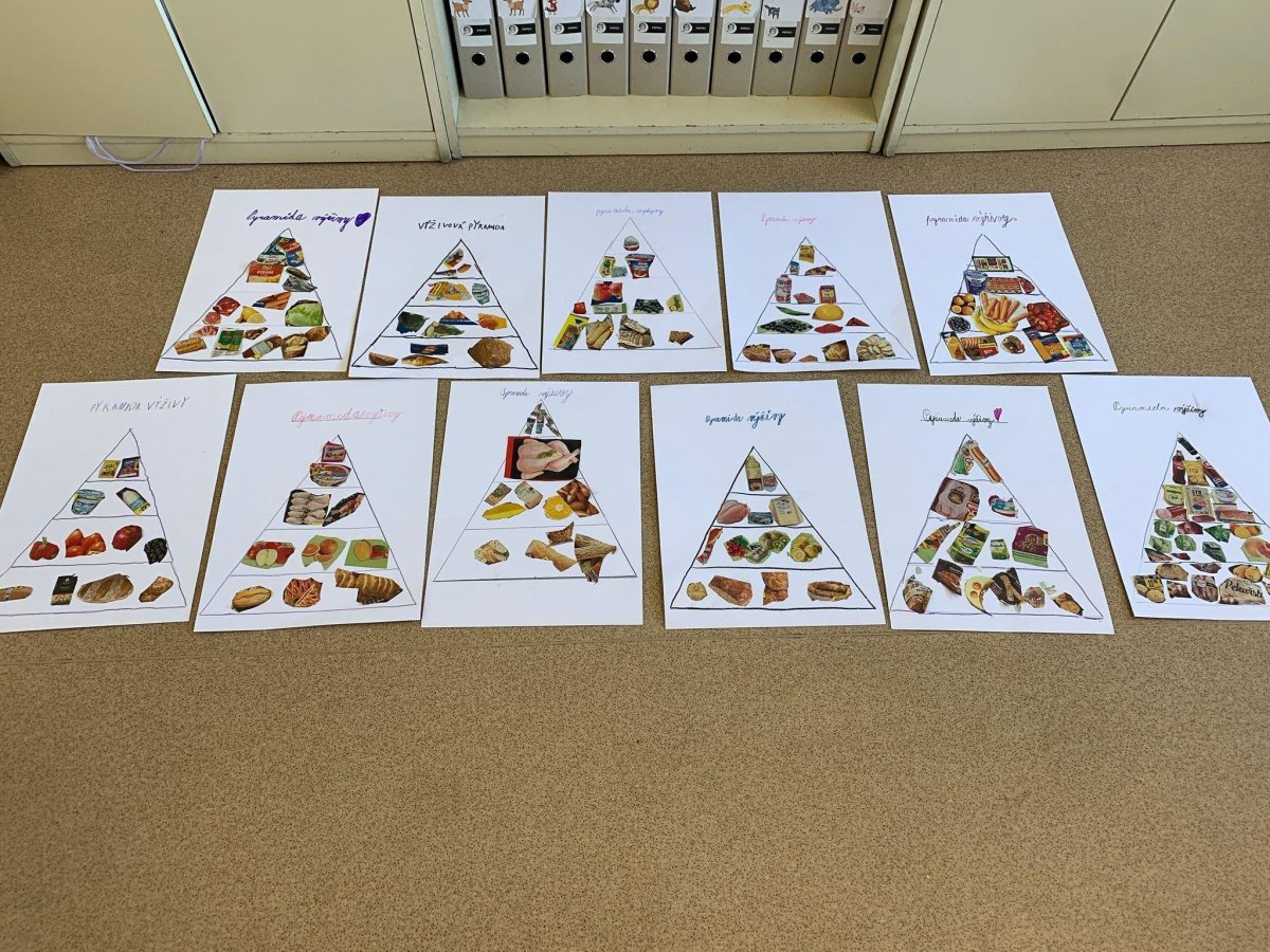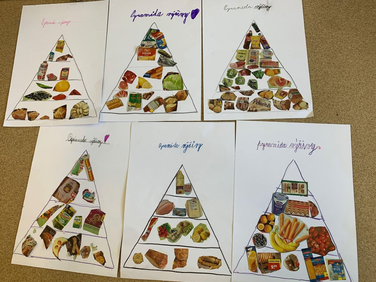 Náš projekt: Zdravá výživa. Podívali jsme se na video, jak zdravě jíst, připravili jsme si zdravé pohoštěni, podívali jsme se na video Pyramida výživy a vyrobili jsme pyramidy z letáků.