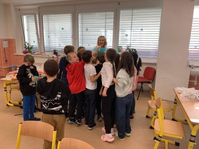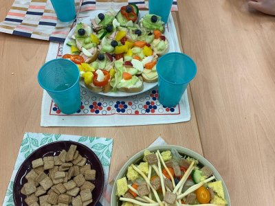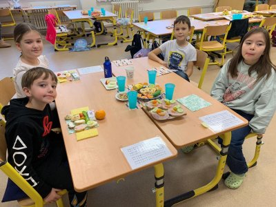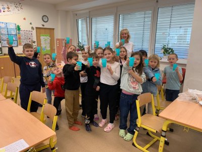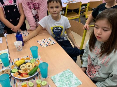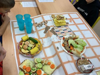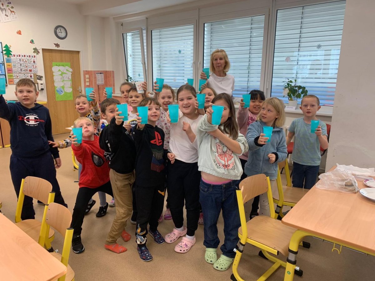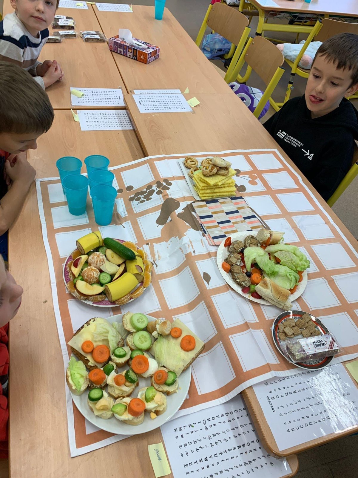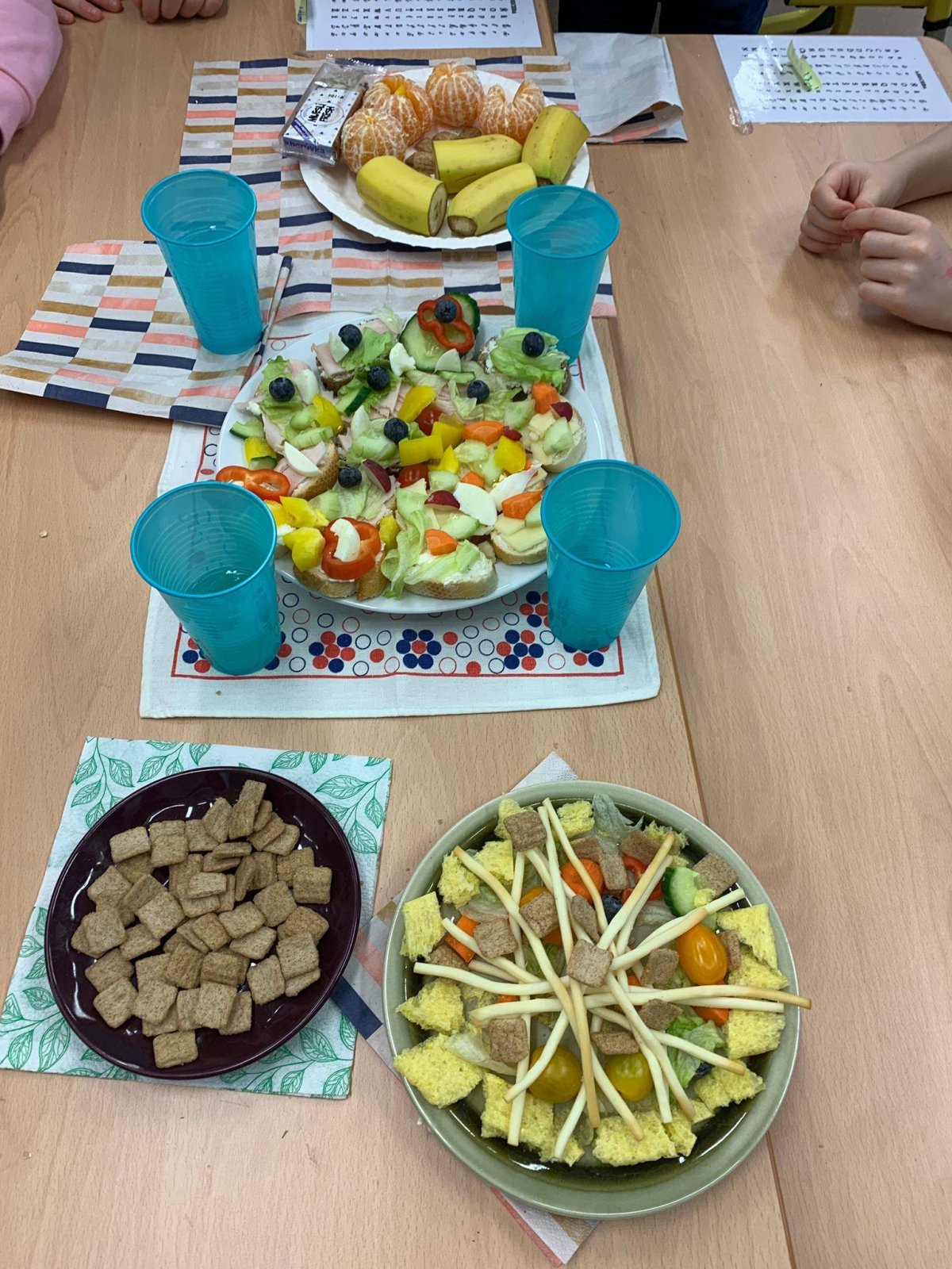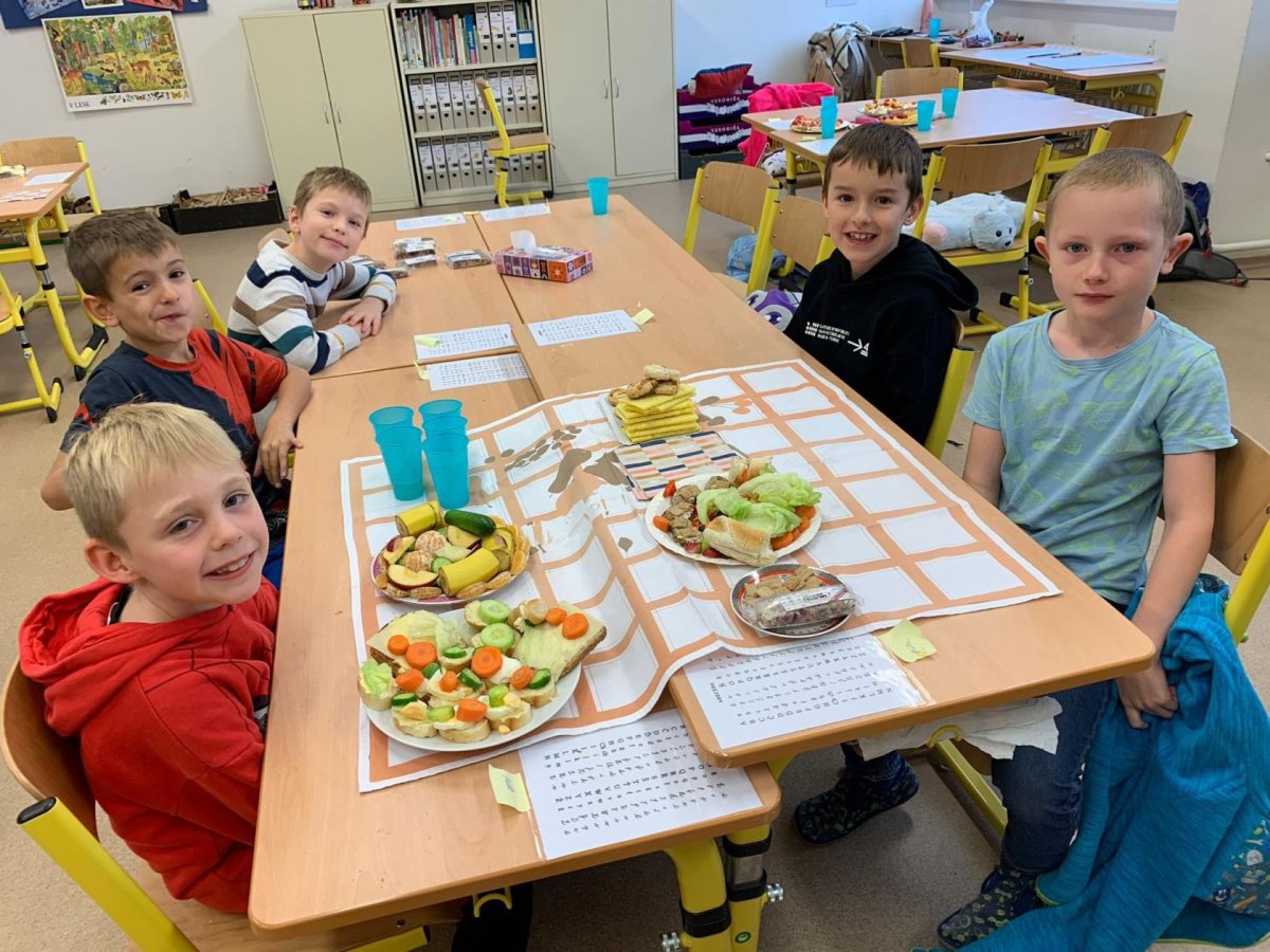Náš projekt: Zdravá výživa. Podívali jsme se na video, jak zdravě jíst, připravili jsme si zdravé pohoštěni, podívali jsme se na video Pyramida výživy a vyrobili jsme pyramidy z letáků.