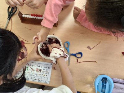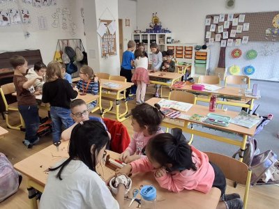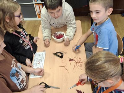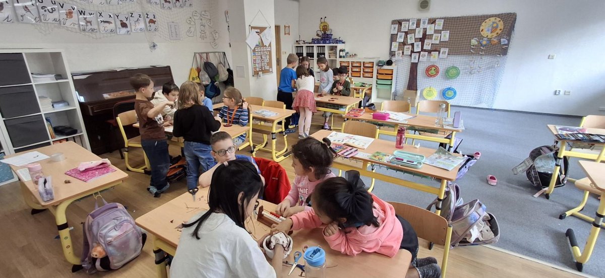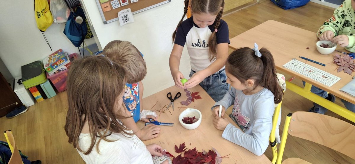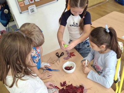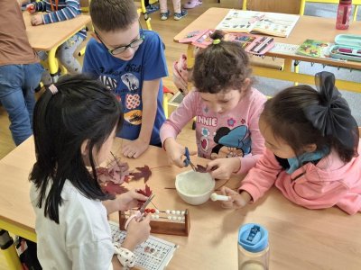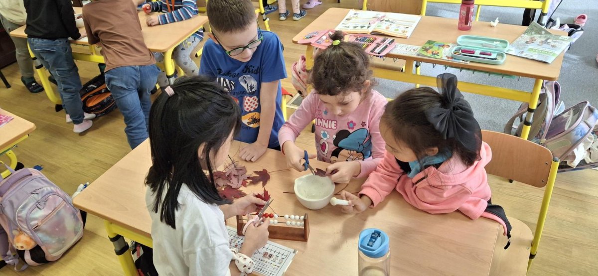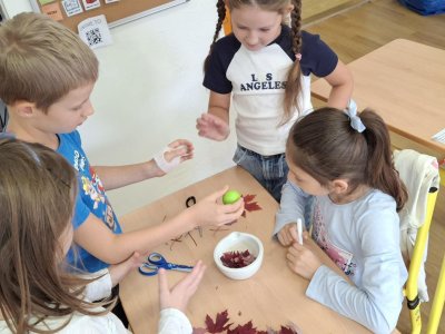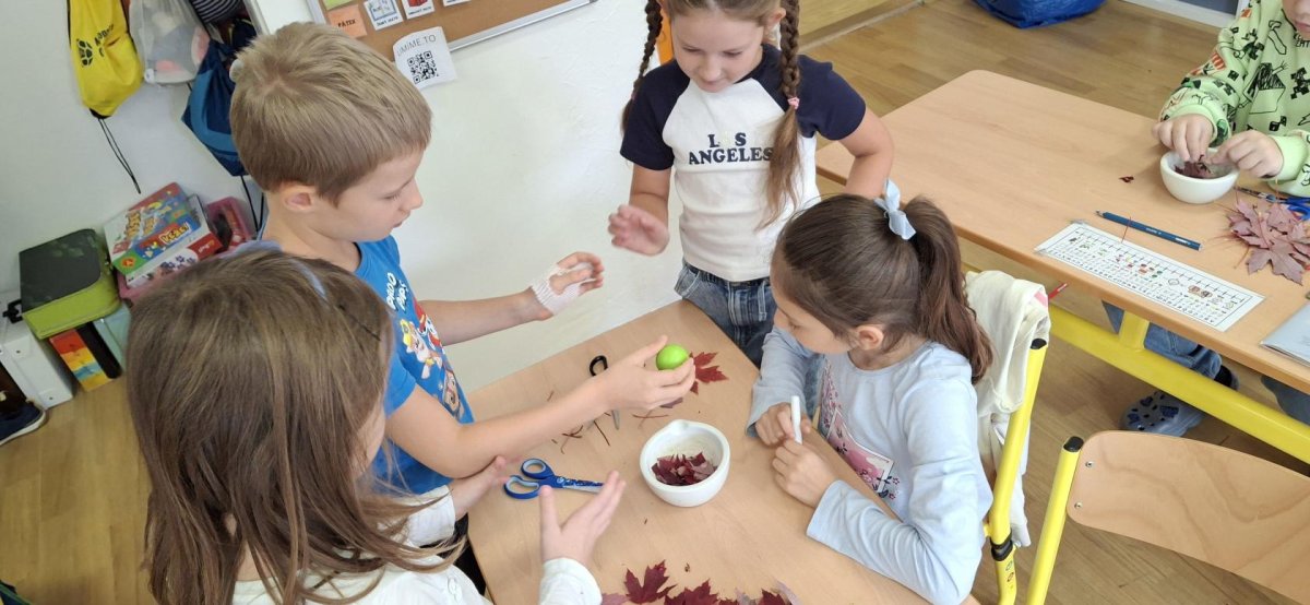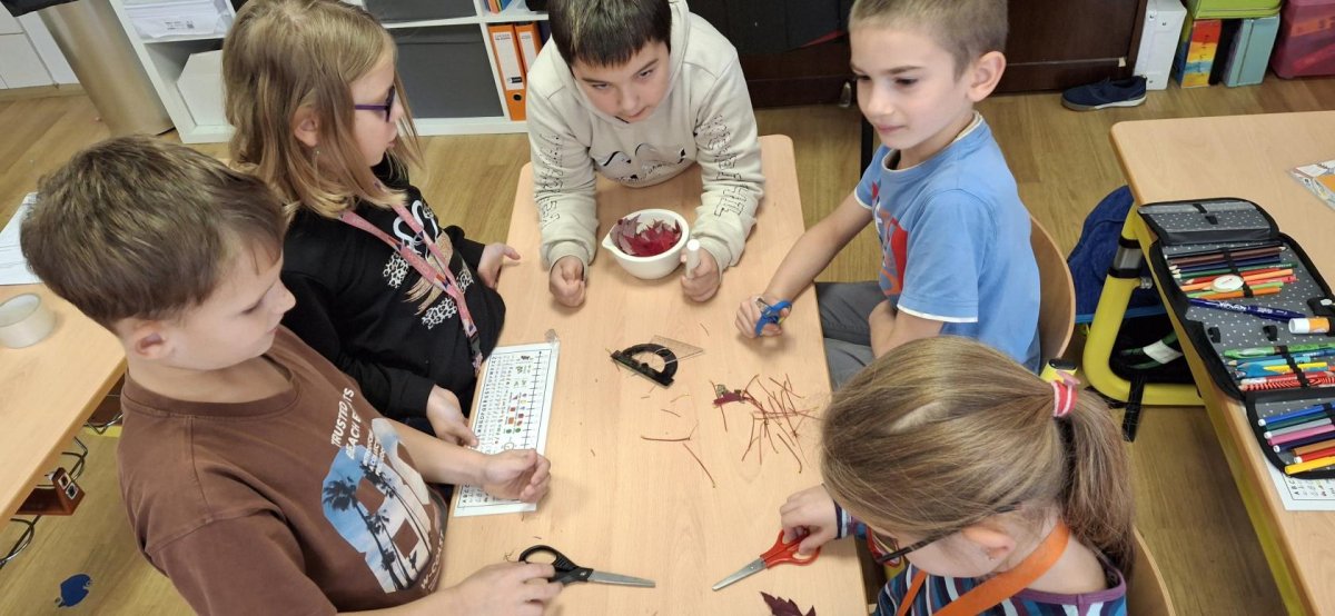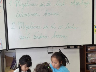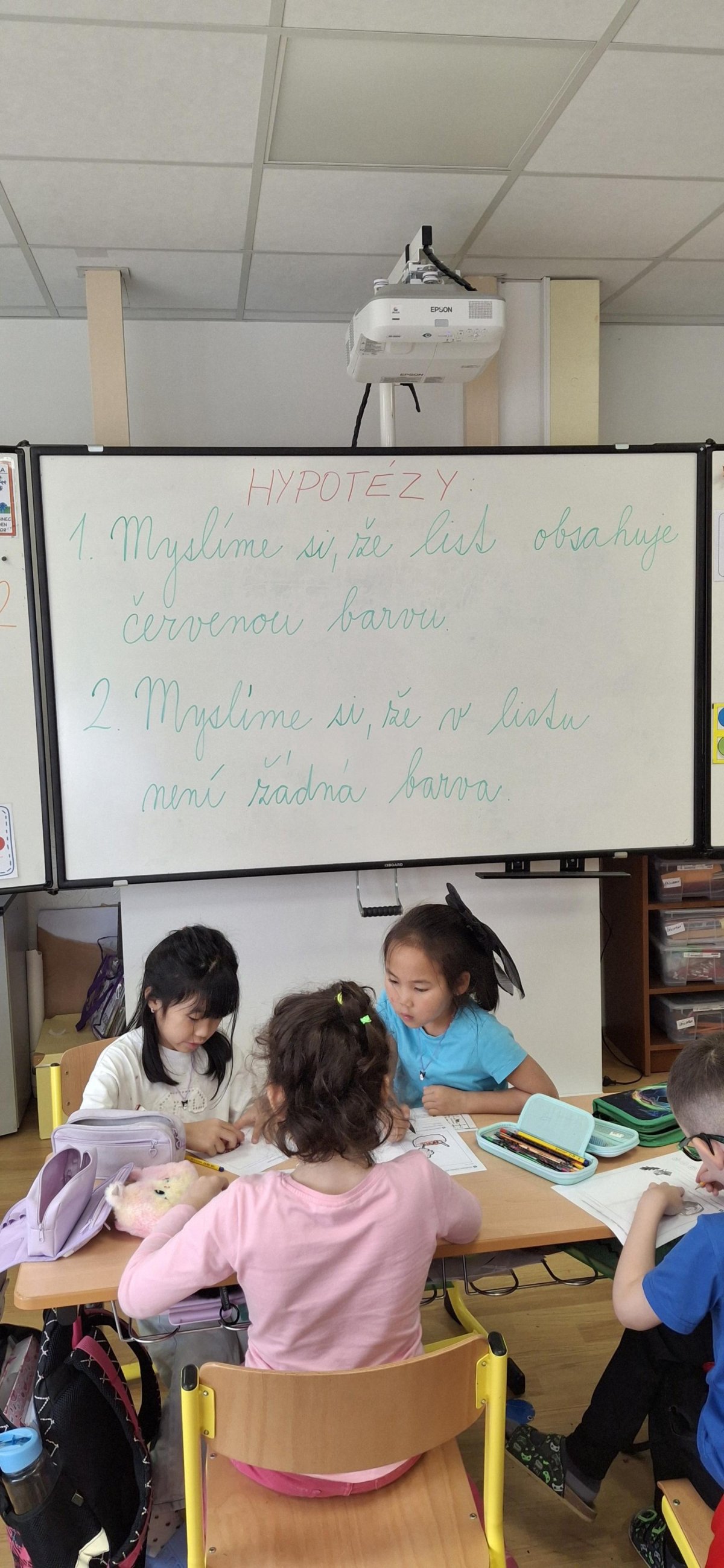 Dnes jsme se v PRV vrhli na badatelský projekt a zkoumali barevnost listí. Zkusili jsme si klást výzkumné otázky a stanovili si 2 hypotézy: 1. Myslíme si, že červené listy javoru obsahují jen červené barvivo. 2. Myslíme si, že listy nebudou obsahovat žádné barvivo. Abychom si naše tvrzení ověřili, ve skupinkách jsme se v hmoždířích pokoušeli dostat z listů co nejvíce šťávy. Dále jsme použili savý papír, po kterém nám tekutina začala vzlínat - které barvy se nám nakonec ukáží, uvidíme ráno.
