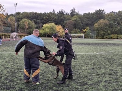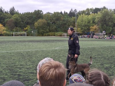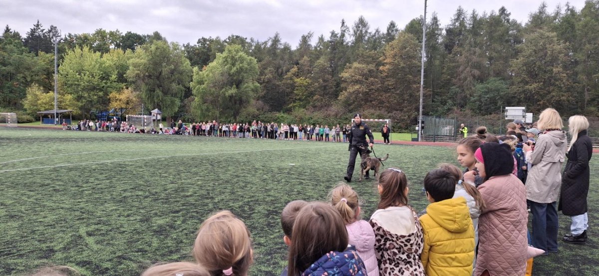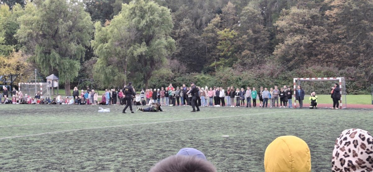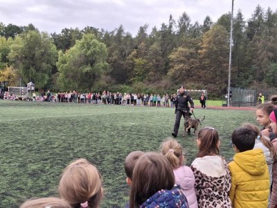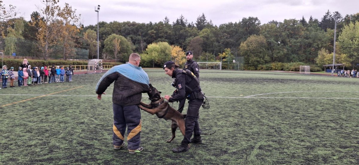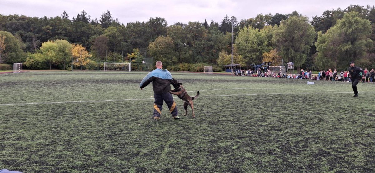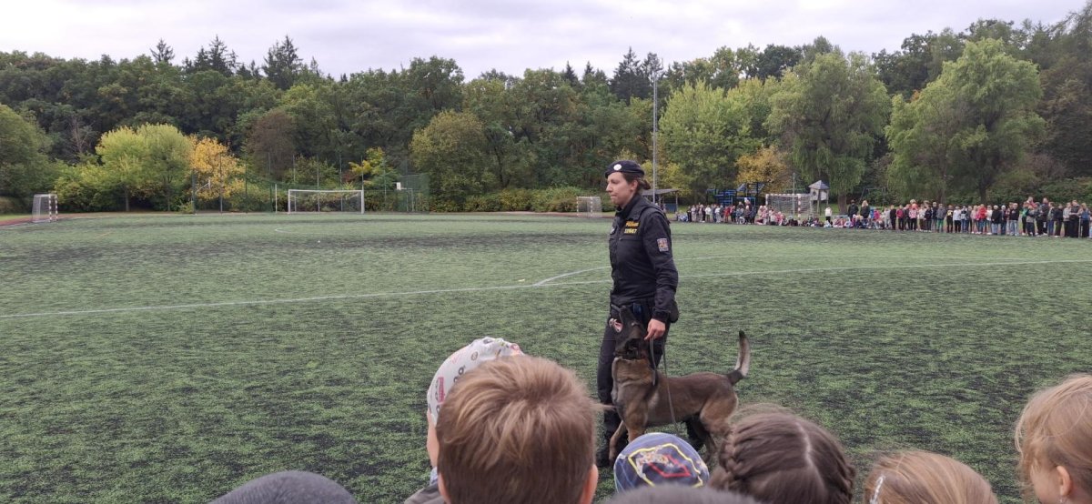 třetí hodinu jsme se zúčastnili programu od policejních psovodů. Čtyřnozí hrdinové nám předvedli ukázky ze svého výcviku – vyhledávání pachatele, poslušnost i práci při zadržení. Děti si mohly zblízka prohlédnout nejen psy, ale i vybavení jejich pánů. Program byl velmi poutavý a žáci se dozvěděli mnoho zajímavostí o náročné, ale důležité práci policejních psů. Na závěr měli možnost položit otázky a odměnit pejsky zaslouženým potleskem.
