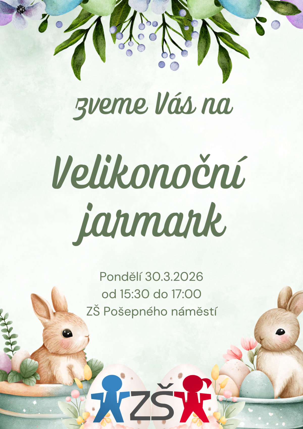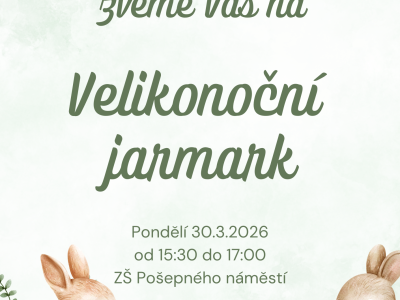 Zveme Vás na Velikonoční jarmark, který se bude konat v pondělí 30. 3. 2026 od 15:30 do 17:00 v prostorách naší školy. K zakoupení budou výrobky žáků ZaS a školní družiny.