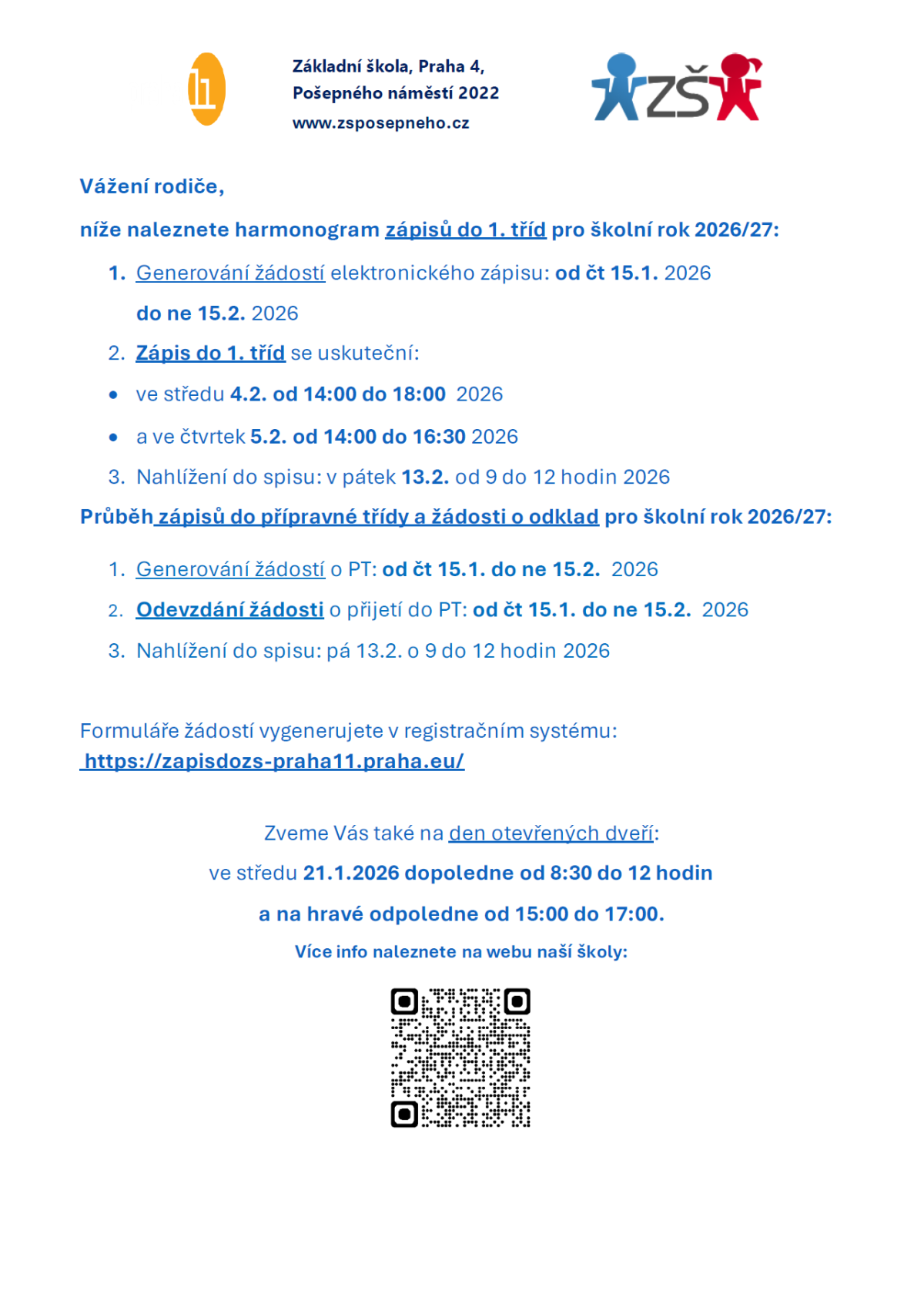 níže naleznete harmonogram zápisů do 1. tříd pro školní rok 2026/27: