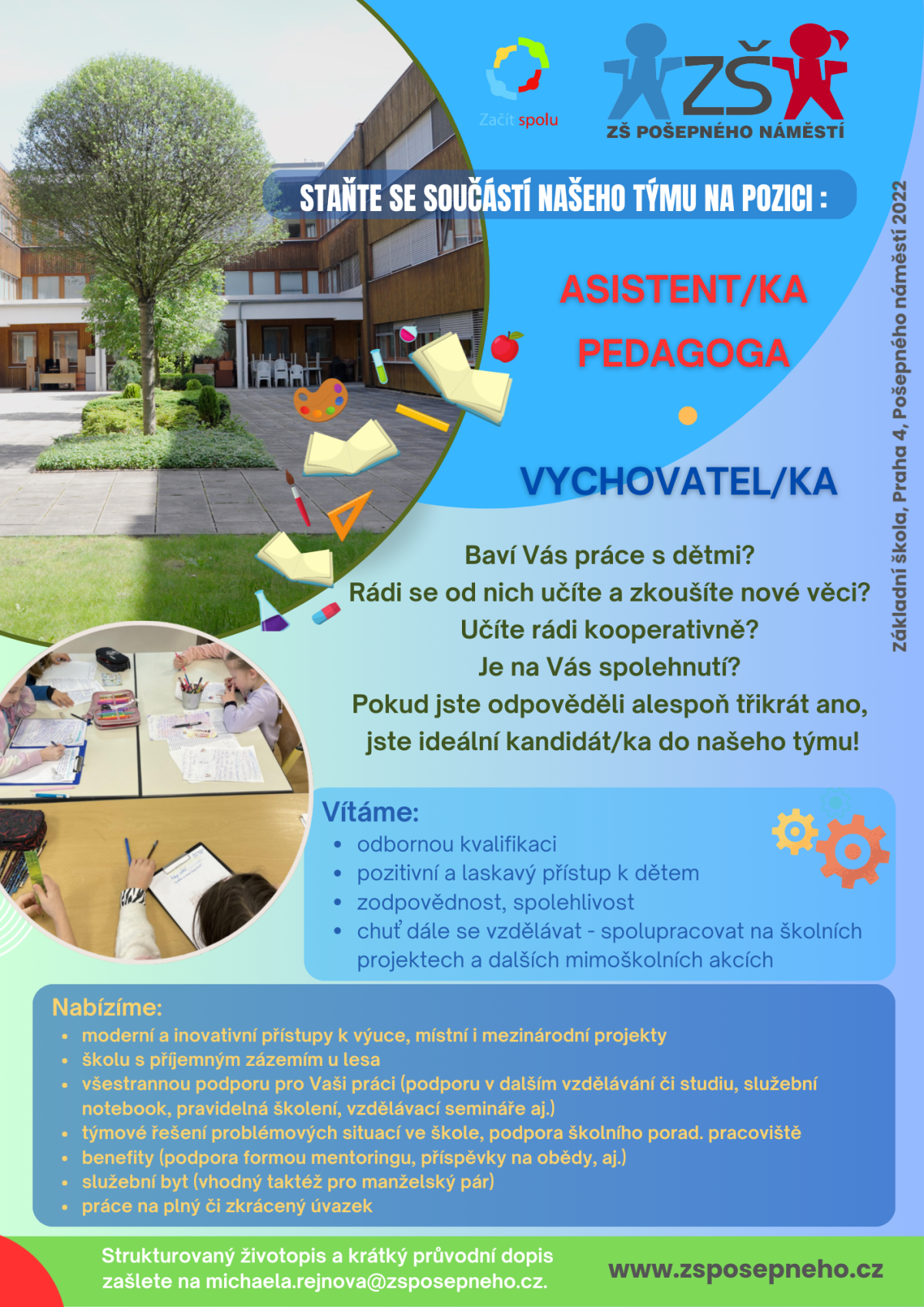 Staňte se součástí našeho týmu na pozici: Asistent/ka pedagoga, Vychovatel/ka školní družiny