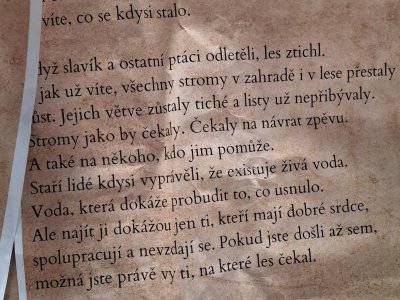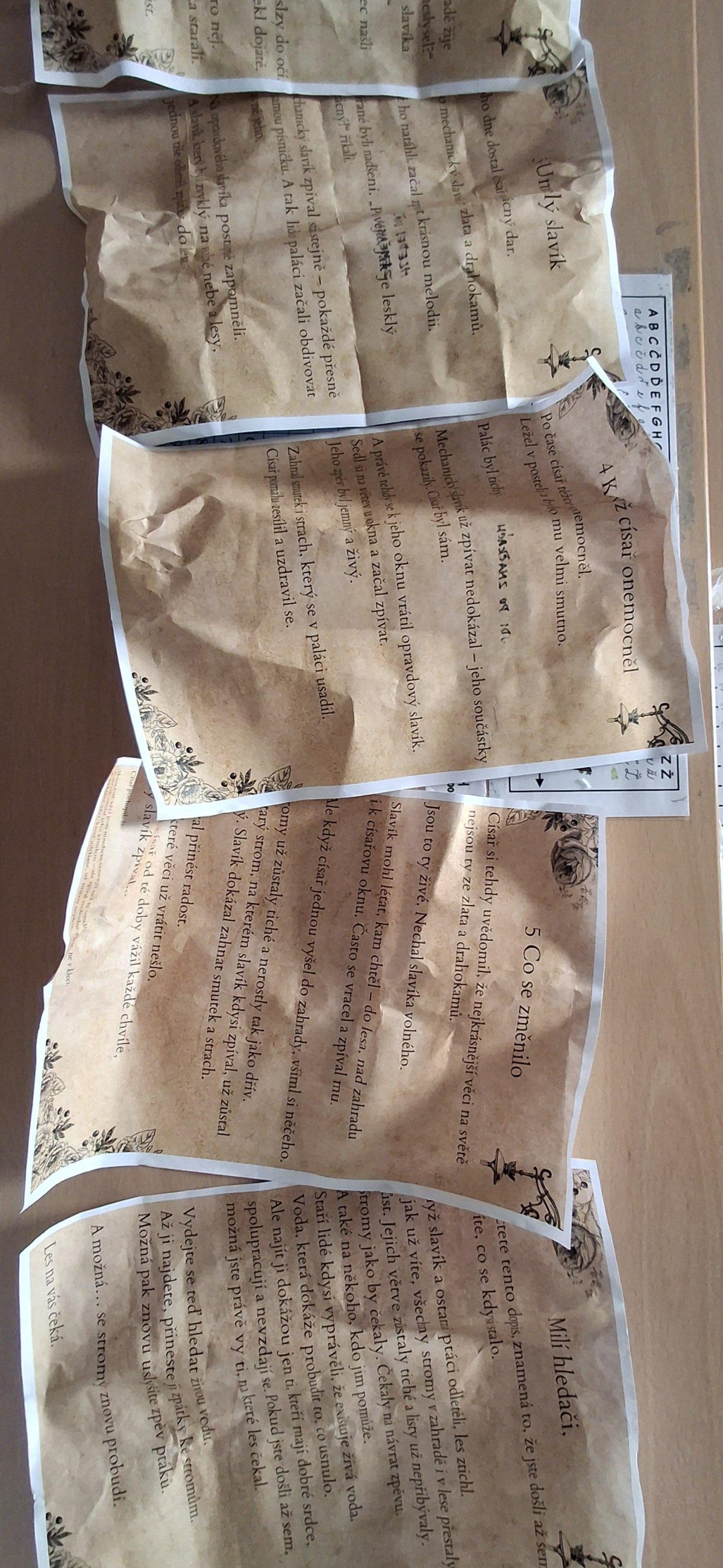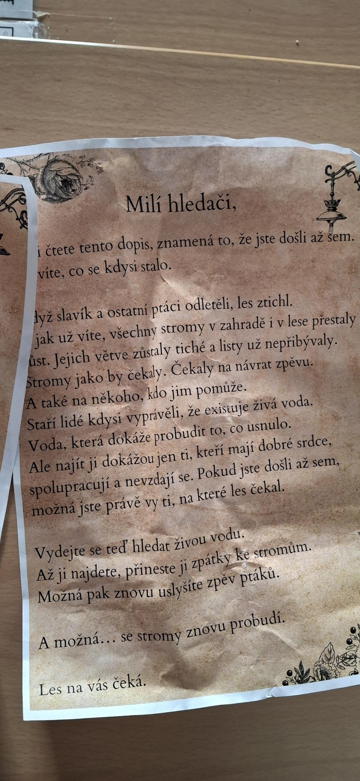 Protože jsme zpočátku netušili, co nás čeká, vydali jsme se po škole hledat první nápovědu. Objevili jsme dopis – a pak další a další. Postupně jsme skládali příběh pohádky O zlatém slavíkovi. Narazili jsme také na uschlý les, který ztratil život poté, co císař zavřel slavíka do klece.