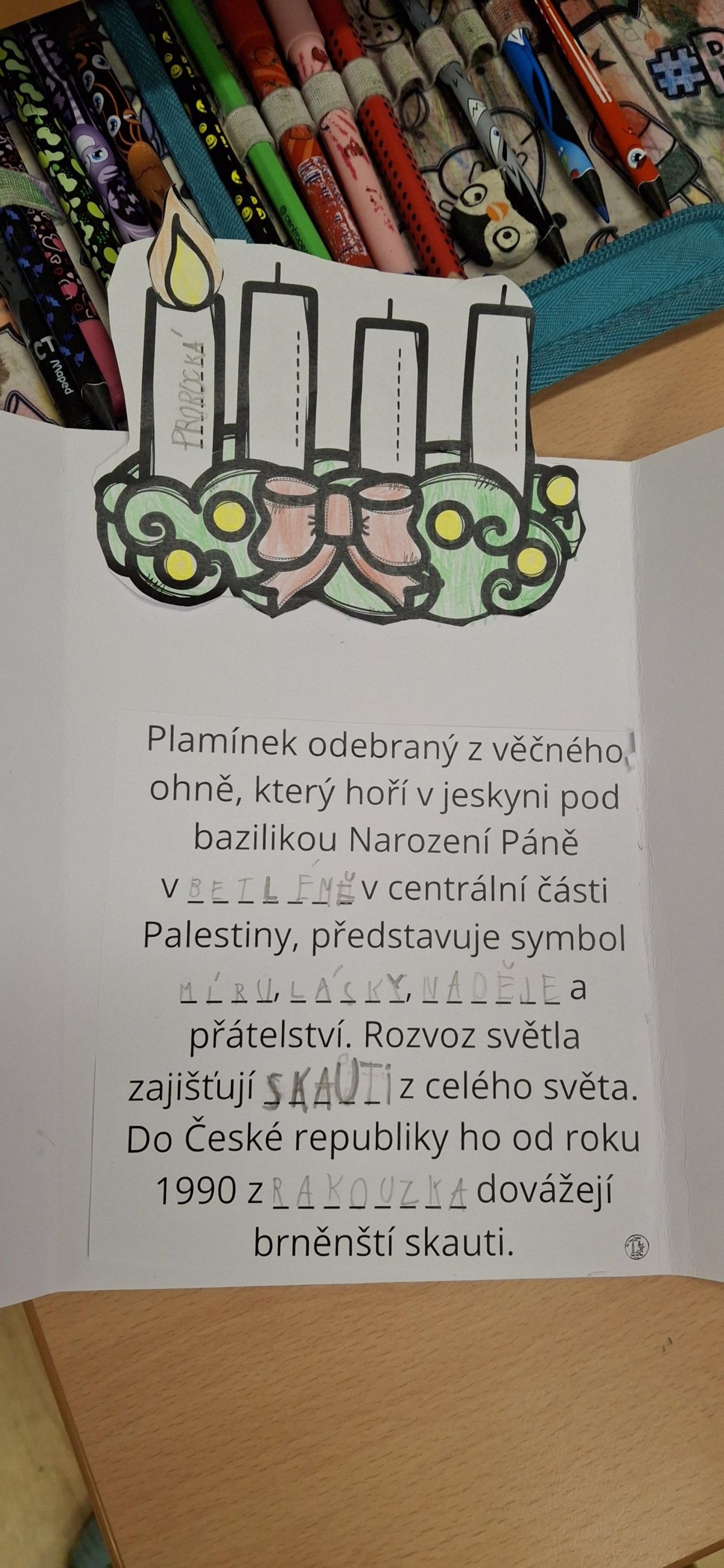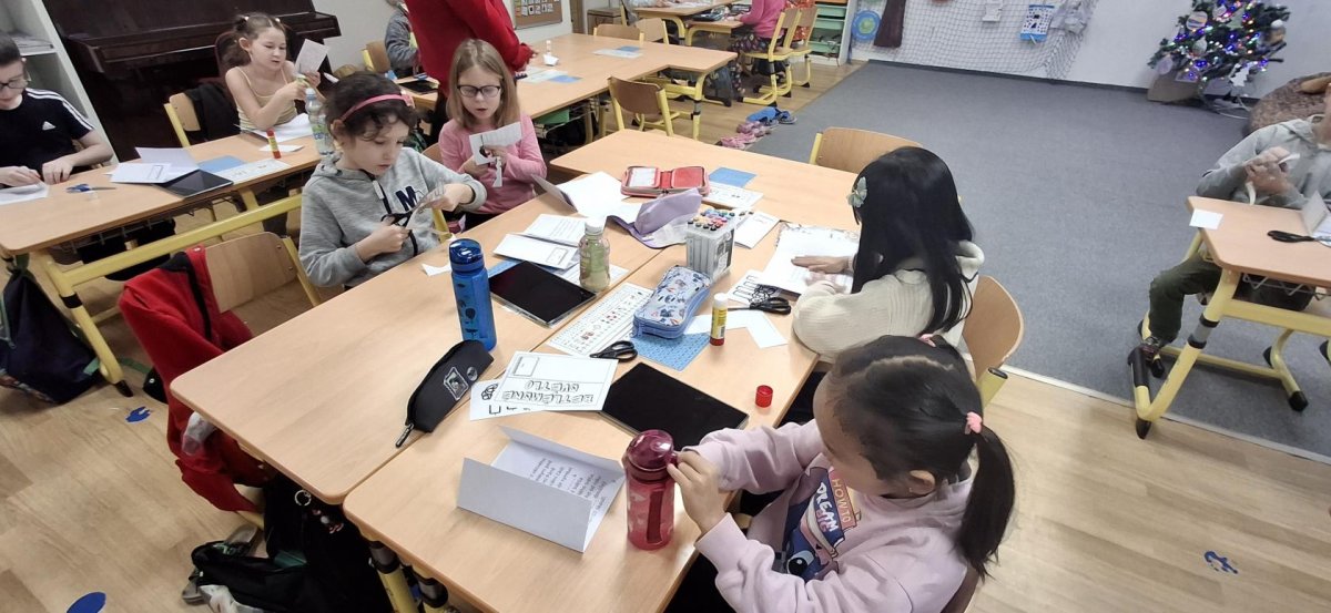 dnes jsme měli plné ruce práce, luštili jsme, využívali tablety a doplňovali náš lapbook. Protože spolupracujeme s 2. B, při poslední hodině nás čekala ještě závěrečná hádanka. Zjistili jsme, že posledním úkolem pro rozsvícení poslední svíčky na našem adventním svícnu bude BRUSLENÍ - zítra se tedy vydáme na kluziště vedle Westfieldu. Ráno se sejdeme ve třídě, ve které ještě hodinu budeme pracovat na projektu. Až pak se vydáme na bruslení - zpět se vracíme na oběd a opět končíme v 11:45.