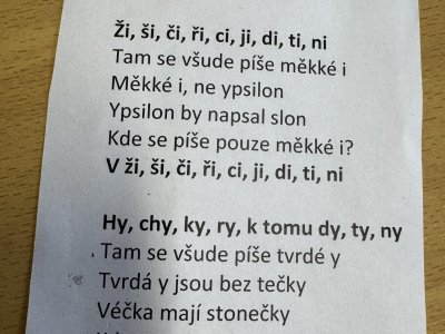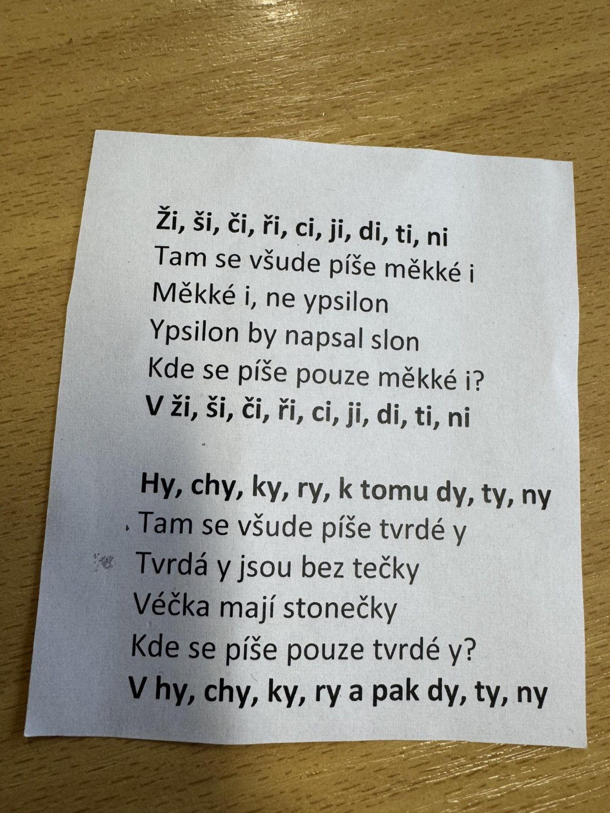 V českém jazyce jsme se společně dopracovali až na stranu 67. Nyní již známe nejen krátké a dlouhé samohlásky, ale i souhlásky, o kterých víme, že se dělí na tvrdé, měkké a obojetné. Dokonce na dvoje z nich jsme si pustili píseň odDády Patrasové, jejíž text jsem dětem dnes rozdala.
